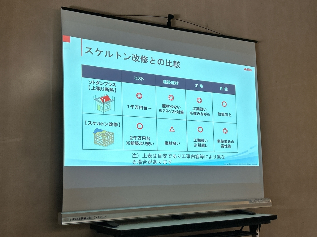 10月23日に、東北アキレス㈱さんをお迎えし、外壁上張り断熱リフォーム工法「ソトダンプラス」の商品説明会を行いました。